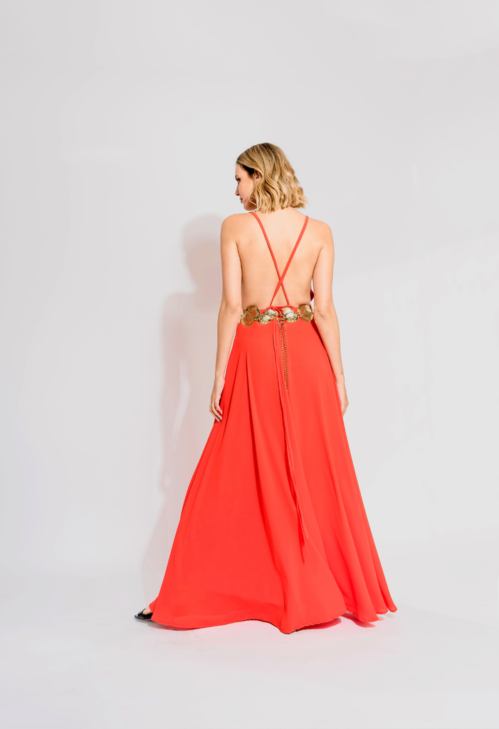 VESTIDO DE FIESTA, CORTE AL BIES, CON ESPALDA DESCUBIERTA Y ESCOTE PROFUNDO.